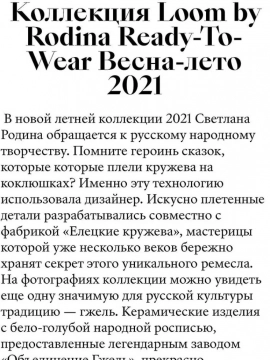 Современное прочтение вышивки,кружева и Поссийского промысла "Елецкие кружева" в новой летней коллекции SS 2021 бренда Loom by Rodina