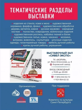 Вход на выставку «Художественные промыслы России», которая пройдет в выставочном зале «Сивел Экспо», в ТВК «Форум», в Санкт-Петербурге с 15 по 19 октября 2024 года, свободный.
