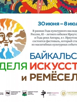 БАЙКАЛЬСКАЯ НЕДЕЛЯ ИСКУССТВА И РЕМЕСЁЛ/ BAIKAL ART & CRAFT WEEK - 2022 состоится 30 июня – 8 июля 2022 года в рамках Года культурного наследия народов России, 85 – летнего юбилея Иркутской области, Года реки Ангары в Иркутске. Проект реализуется при поддержке Президентского фонда культурных инициатив Правительства Иркутской области и Администрации города Иркутска Организатор: Евразийская ассоциация этнодизайнеров (ЕАЭ).