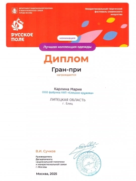 Фабрика «Елецкие кружева» получила гран-при в номинации «Лучшая коллекция одежды» и завоевала 1 место в номинации «Лучший товаропроизводитель».