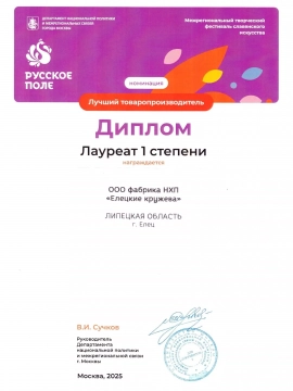 На прошедшем 9 августа 2025 года XIV Межрегиональном творческом фестивале славянского искусства «Русское поле» фабрика «Елецкие кружева» представила коллекцию «Нежная сила».
