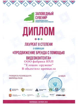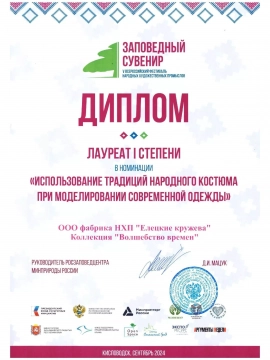 Наша команда вложила душу и мастерство в каждое изделие, демонстрируя богатство и уникальность елецкого кружева. Мы счастливы, что наше творчество было отмечено высокой оценкой жюри и широким кругом ценителей народного искусства. Эта награда - не только знак признания нашей работы, но и стимул для дальнейшего совершенствования и инноваций в промысле.