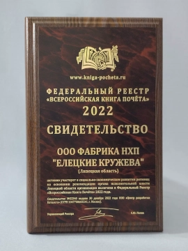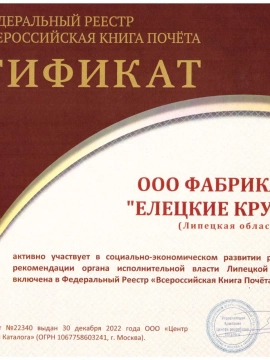 ООО фабрика НХП "Елецкие кружева" активно участвует в социально-экономическом развитии региона; на основании рекомендации органа исполнительной власти Липецкой области организация включена в Федеральный реестр "Всероссийская Книга Почёта" 2022 года.