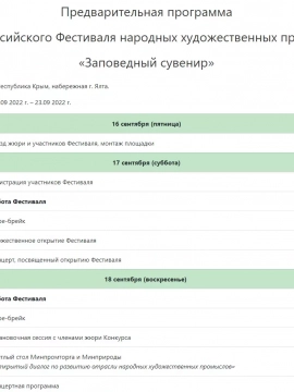 В сентябре 2022 г. на набережной г. Ялты (Республика Крым) в третий раз состоится Фестиваль народных художественных промыслов "Заповедный сувенир", который включает ряд мероприятий: