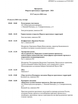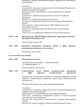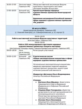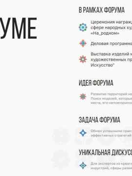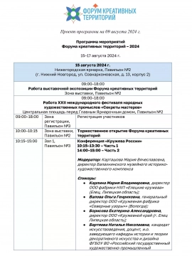 С 15 по 17 августа в историческом здании Нижегородской ярмарки, одном из символов города, пройдет Форум креативных территорий-2024. Мероприятие, которое стало уже традиционным, объединит экспертов, предпринимателей и представителей органов власти для обсуждения актуальных вопросов развития народных художественных промыслов (НХП) и креативных индустрий. В 2024 году более 30 отечественных компаний и предприятий примут участие в Форуме при содействии и поддержке Минпромторга России. В рамках форума: - Церемония награждения Российской премии в сфере народных художественных промыслов «На_родном» - Деловая программа - Выставка изделий мастеров народных художественных промыслов "История. Человек. Искусство" Идея форума: Развитие территорий на основе культурного кода. Поиск моделей, которые акцентируют уникальность места, его неповторимость и узнаваемость. Задача Форума: Обмен успешными практиками, содействие созданию эффективных стратегий развития регионов России. Уникальная дискуссионная площадка: Для экспертов из креативной, туристической индустрий, сферы развития городской среды и т.д. Форум креативных территорий направлен на развитие и популяризацию народных художественных промыслов, а также сохранение и укрепление традиционных ценностей и национальной идентичности народов России. В рамках мероприятия будут рассмотрены ключевые вопросы, такие как: развитие отрасли, популяризация продукции российских производителей народных художественных промыслов, создание площадки для диалога представителей органов исполнительной и законодательной власти. Основными задачами Форума креативных территорий являются: формирование и продвижение лучших практик взаимодействия производителей с художниками, архитекторами, дизайнерами и другими представителями креативных индустрий; популяризация и продвижение производителей изделий НХП. Мероприятие является уникальной возможностью для обмена опытом, обсуждения актуальных вопросов и установления новых деловых контактов. В этом году участники смогут не только обсудить важные вопросы, но и погрузиться в уникальную атмосферу этого исторического места.