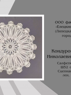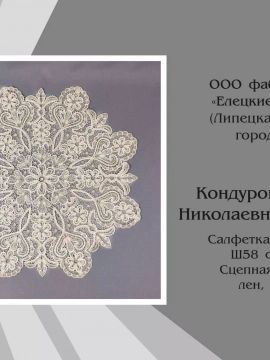 За салфетки «Ирисы» и «Гармония», представленные фабрикой «Елецкие кружева» в номинации «За сохранение традиций народного искусства», дипломом была отмечена Кондурова Оксана Викторовна.