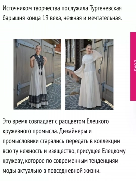 Это время совпадает с расцветом Елецкого кружевного промысла. Дизайнеры и промысловики старались передать в коллекции всю ту нежность и изящество, присущее Елецкому кружеву, которое по современным тенденциям моды актуально в повседневной жизни.
