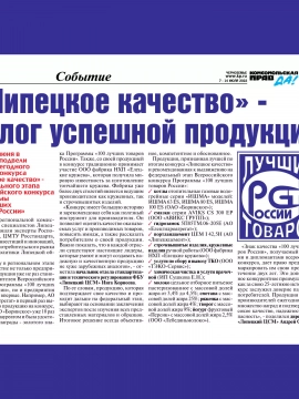 «Знак качества «100 лучших товаров России», получаемый лауреатами и дипломантами всероссийского конкурса, дает право предприятиям маркировать им свою продукцию в течение двух лет. Это дополнительное конкурентное преимущество, так как за свою 25-летнюю историю конкурс заслужил доверие партнеров и потребителей. Продукция липецких производителей ежегодно получает множество наград и подтверждает высокое качество, надежность и безопасность», – поделился директор ФБУ «Липецкий ЦСМ» Андрей Сидоров.