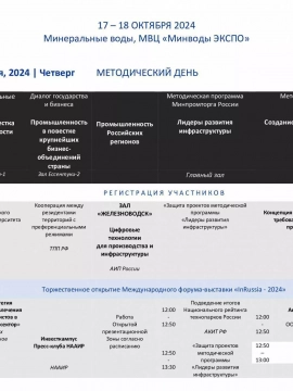 С 17 по 18 октября 2024 года в многофункциональном выставочном центре «МинводыЭКСПО» в городе Минеральные Воды состоится Международный форум-выставка «InRussia». Мероприятие проводится Минпромторгом России и Правительством Ставропольского края.