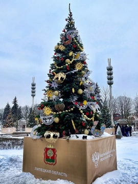 Наша новогодняя ёлка украшена традиционными изделиями народного промысла липецкого края. Глиняными игрушками: романовской, юрьевской и добровской. Тесьмой из кружева длиной 80 метров, сплетённой елецкими мастерицами. Визитная карточка нашего региона – «липецкие узоры» украсили размещённые на ёлке деревянные изделия.