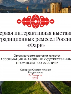 Ассоциация «Народные художественные промыслы Республики Северная Осетия-Алания» приглашает вас с 2 по 7 августа в столицу Республики Северная Осетия-Алания город Владикавказ на Первую выставку-ярмарку народных художественных промыслов «ФАРН».