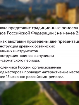 Первая интерактивная выставка традиционных ремесел России будет проходить в выставочном зале Национального музея РСО-Алании. На площади 355 м2 по адресу: ул. Горького, 8.