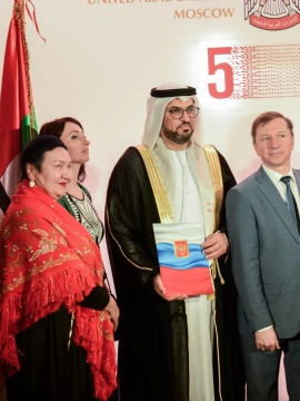 По приглашению Чрезвычайного и Полномочного Посла Объединенных Арабский Эмиратов в Российской Федерации г-на Мухаммеда Ахмеда Аль Джабера генеральный директор компании «Экспоресурс – выставки и конференции» и заместитель Председателя Правления Ассоциации «Наследие и традиции» Комаров Алексей Юрьевич принял участие в торжественном приеме, организованном по случаю 51-ой годовщины со дня образования ОАЭ. Поздравляя Объединенные Арабские Эмираты со знаменательной датой, Алексей Комаров передал приветственный адрес господину Послу. Уверены в дальнейшем развитии сотрудничества во благо народов двух стран. Благодарим господина Посла за активную поддержку и планы по реализации совместных культурных проектов в области поддержки традиционной народной культуры двух стран.