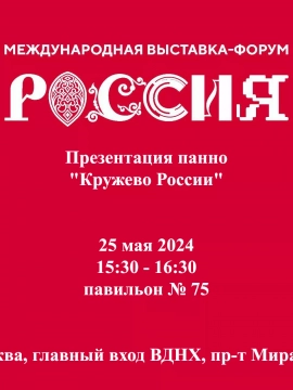 На протяжении нескольких месяцев лучшие кружевницы семи регионов России: Вологодской, Ярославской, Нижегородской, Липецкой, Рязанской, Кировской и Ленинградской областей, а также г. Санкт-Петербурга выплетали фрагменты масштабного кружевного панно "Кружево России". Мастерицы из разных регионов совместными усилиями создали панно в цветах российского флага, используя также символику Международной выставки-форума «Россия».