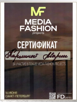 Рады представить сертификат, врученный нашему директору Марии Владимировне Карлиной за участие в проекте MEDIA FASHION PROJECTS.