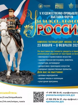 V Художественно-промышленная выставка-форум «Уникальная Россия» пройдет с 23 января по 9 февраля 2025 года в московском Гостином дворе. Грандиозное событие объединит тысячи художников, скульпторов, мастеров, дизайнеров, руководителей промышленных предприятий, представителей учреждений культуры и туристических администраций, органов государственной власти и, конечно же, профессионалов и любителей истории и культуры со всего мира.