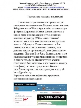 В мессенджере "Telegram" мошенники создали двойник аккаунта руководителя фабрики "Елецкие кружева" и ведут через него переписку от имени Мария Карлина. Ниже прикреплены скриншоты, по которым можно понять, как распознать настоящий аккаунт и отличить его от аккаунта мошенников.