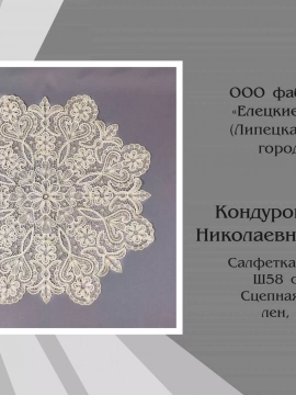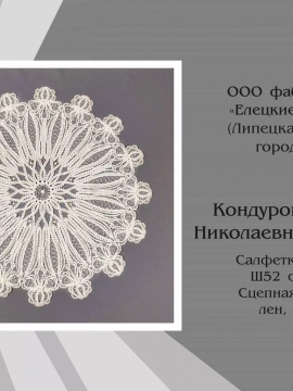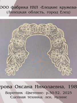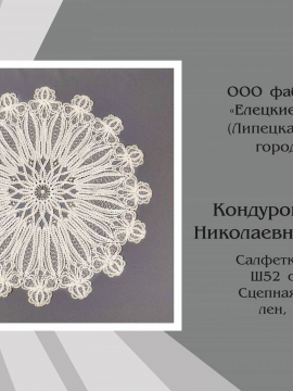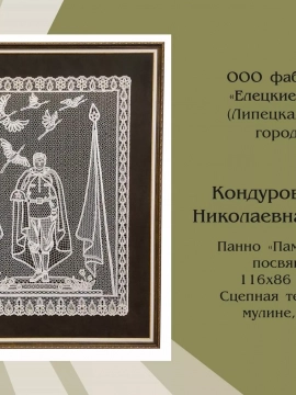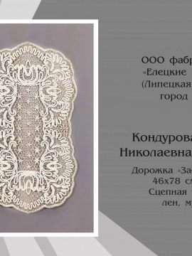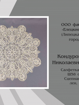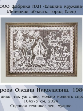 Работы фабрики «Елецкие кружева» представлены сразу в четырех номинациях «80 лет Великой Победы советского народа в Великой Отечественной войне», «Сказка в народном искусстве», «Народное искусство и современность», «За сохранение традиций народного искусства».