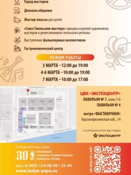 С 3 по 7 марта 2021 года в ЦВК «Экспоцентр» пройдет крупнейшая в стране выставка-ярмарка народных художественных промыслов «ЛАДЬЯ. Сезон 2020-2021», которая состоится при соблюдении всех необходимых мер безопасности по предупреждению распространения новой коронавирусной инфекции (COVID-19). Выставка организуется Ассоциацией «Народные художественные промыслы России», при поддержке Министерства промышленности и торговли Российской Федерации, Торгово-промышленной палаты Российской Федерации. Соорганизатор выставки – АО «ЭКСПОЦЕНТР».