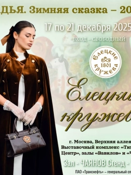 С 17 по 21 декабря 2025 года в Выставочном комплексе «Тимирязев Центр» «Елецкие кружева» представят свои изделия на выставке‑ярмарке «ЛАДЬЯ. Зимняя сказка» в зале - Чаянов на стенде ЧЕ-10. Это событие по праву считается главным зимним фестивалем народных художественных промыслов России. Здесь под одной крышей соберутся сотни мастеров и организаций промыслов из десятков регионов страны, чтобы показать лучшее, что хранит и создаёт наше культурное наследие.