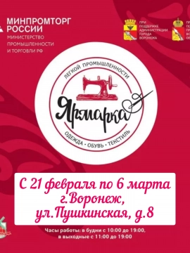 С 21 февраля по 6 марта в Воронеже пройдет всероссийская ярмарка одежды, обуви и текстиля Министерства промышленности и торговли РФ.