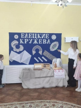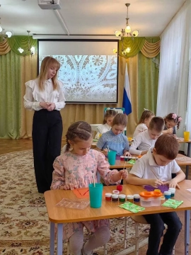 Воспитатель Зарочинцева Светлана Васильевна представила педагогам занятие по художественно-эстетическому развитию в старшей группе компенсирующей направленности на тему: «Лёгких нитей хоровод». В ходе образовательной деятельности дети упражнялись в рисовании простейших узоров елецкого кружева («плетешок», «сетка», «полотнянка», «насновка»), учились самостоятельно составлять узор салфетки, совершенствовали технические навыки рисования концом кисти.